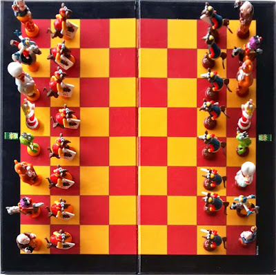 Heel erg leuk. Toch is er - in mijn ogen - ook een minpuntje. De stukken zijn in beide kleuren hetzelfde. Ik denk dat het leuker was geweest om bijvoorbeeld aan de ene kant de kok (2x dezelfde) als loper te hebben en aan de andere kant tweemaal Fozzie Beer als loper. Dan heb je als het ware twee partijen tegen elkaar. Maar gied. De sfeer is prima. Alleen nog een keer de originele verpakking zien te vinden..